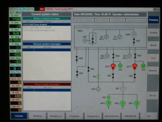 Operational pressure is 5×10-4 mbar. The parts to be welded are moved by a high-precision manipulator located inside the chamber
